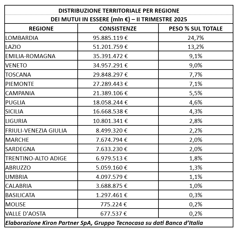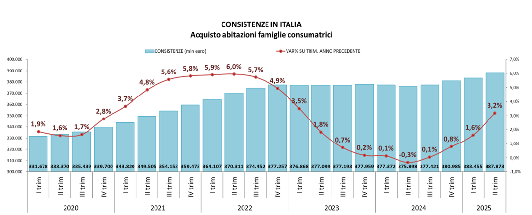 Kìron Partner SpA, Gruppo Tecnocasa ha analizzato i dati di Banca d’Italia relativi allo stock di mutui in essere concessi alle famiglie italiane per l’acquisto dell’abitazione ed ancora in corso, nel secondo trimestre 2025 ci attestiamo a 387,8 miliardi di euro con un aumento pari al +1,15% rispetto al primo trimestre 2025. Se il confronto venisse fatto su base annua (II trim 2025 su II trim 2024) lo stock attivo circolante dei mutui alla famiglia per l’acquisto dell’abitazione risulterebbe in aumento del +3,2%.