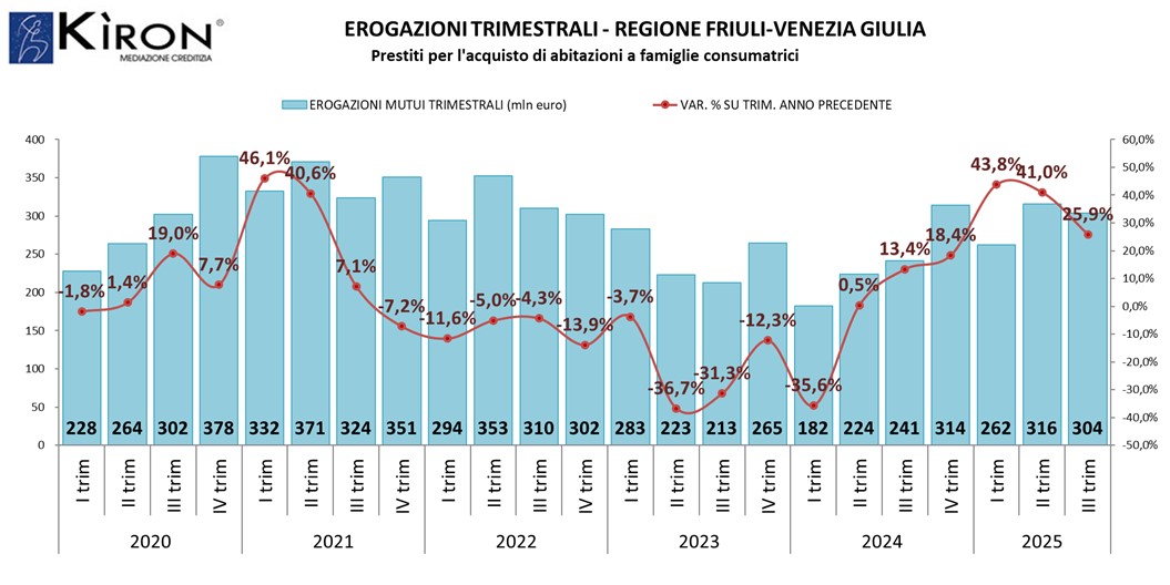 La provincia di Gorizia ha erogato volumi per 38,4 mln di euro, con una variazione rispetto allo stesso trimestre del 2024 pari a +39,8%. Nei primi nove mesi del 2025, sono stati erogati 106,1 mln di euro, pari a +42,0%.