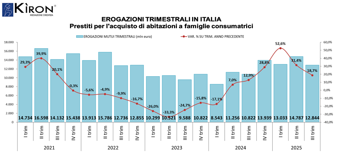 Secondo gli analisti di Kìron Partner SpA, società di mediazione creditizia del Gruppo Tecnocasa, anche nel terzo trimestre del 2025 il mercato dei mutui ipotecari continua la sua significativa crescita confermando il trend già riscontrato nelle precedenti rilevazioni. Le famiglie italiane hanno ricevuto finanziamenti per l’acquisto della casa per un totale di 12,8 miliardi di euro, segnando un importante aumento di quasi il +19% rispetto allo stesso periodo del 2024 (+2.021 milioni di euro).