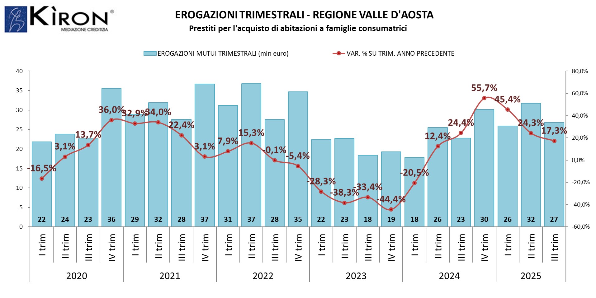 La provincia di Aosta ha erogato volumi per 26,8 mln di euro, facendo registrare una variazione rispetto allo stesso trimestre dello scorso anno pari a +17,3%. Nei primi nove mesi del 2025, invece, sono stati erogati 84,3 mln di euro, pari a +27,5%.