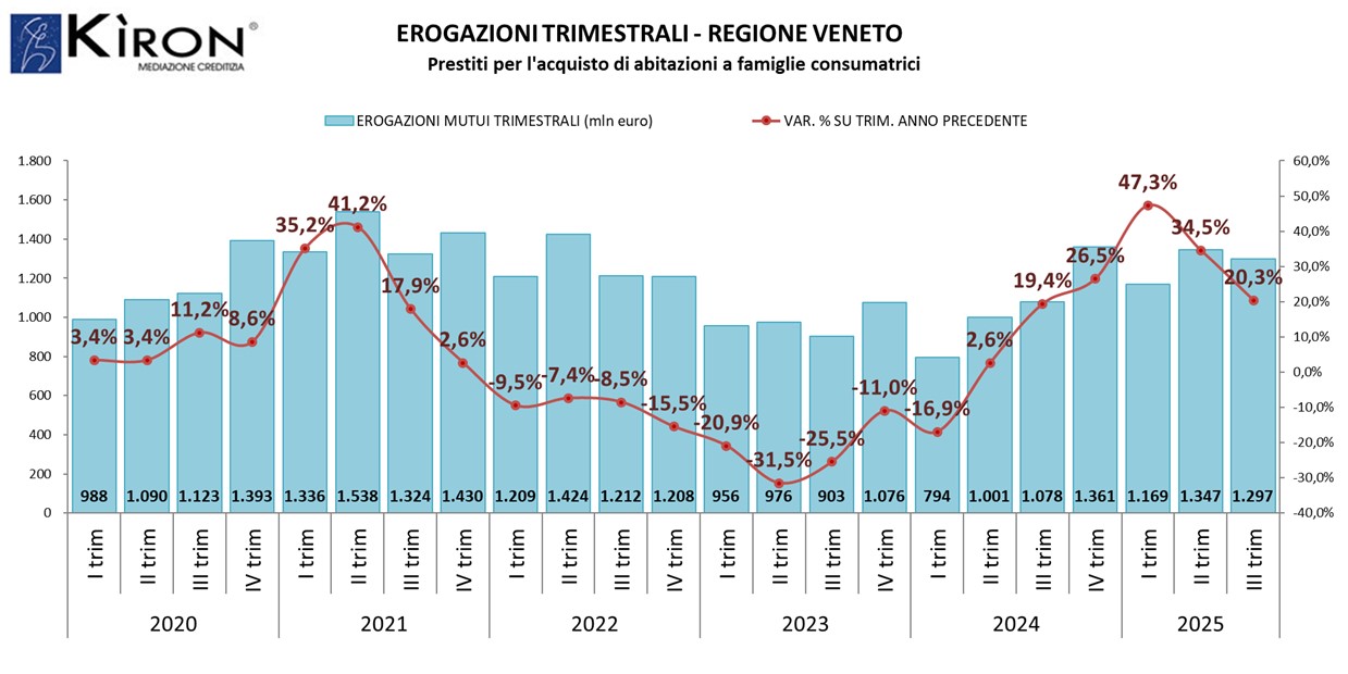 La provincia di Belluno ha erogato volumi per 35,6 mln di euro, facendo registrare una variazione rispetto allo stesso trimestre dello scorso anno pari a +15,4%. Nei primi nove mesi del 2025, invece, sono stati erogati 110,9 mln di euro, pari a +28,8%. A Padova sono stati erogati volumi per 257,3 mln di euro, corrispondenti a una variazione rispetto allo stesso periodo dell’anno precedente pari a +14,2%. Da gennaio a settembre sono stati erogati 804,9 mln di euro (+34,3%). La provincia di Rovigo ha erogato volumi per 37,5 mln di euro, la variazione sul trimestre è pari a +33,0%. I primi nove mesi dall’anno hanno evidenziato volumi per 107,4 mln di euro, corrispondenti a +27,0%. In provincia di Treviso i volumi erogati sono stati 231,1 mln di euro, con una variazione pari a +26,3%. Quelli nei tre trimestri considerati sono stati 674,9 mln di euro, (+35,0% rispetto allo stesso periodo del 2024). In provincia di Venezia sono stati erogati volumi per 249,8 mln di euro, la variazione rispetto allo stesso trimestre dell’anno precedente pari a +16,6%. I primi nove mesi hanno visto un totale di 711,9 mln di euro, con una variazione di +27,8%. Verona ha erogato volumi per 268,0 mln di euro, la variazione sul trimestre è pari a +22,5%. I primi nove mesi dell’anno hanno evidenziato volumi per 784,9 mln di euro e una variazione pari a +33,0%. La provincia di Vicenza ha erogato volumi per 217,8 mln di euro, facendo registrare una variazione sul trimestre pari a +22,7%. I tre quarti del 2025, invece, hanno segnalato un totale di 617,9 mln di euro, con una variazione di +35,6%.