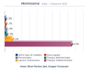Dall’analisi della professione del mutuatario emerge che la sicurezza economica è tra gli elementi fondamentali richiesti dagli istituti di credito per erogare un finanziamento. Tale caratteristica identifica l’87,4% del campione (dipendenti a tempo indeterminato e pensionati), a fronte del 9,1% di chi ha un contratto di lavoro flessibile (liberi professionisti/lavoratori autonomi e titolari d’azienda) e del 2,3% di lavoratori a tempo determinato.