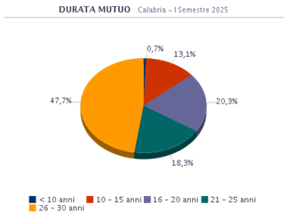Segmentando per fasce di durata, emerge che il 47,7% dei mutui ha una durata compresa tra 26 e 30 anni, il 18,3% si colloca nella fascia 21-25 anni, il 20,3% ricade nella durata 16-20 anni, il 13,1% si colloca nella fascia 10-15 anni.  I prestiti ipotecari di durata inferiore a 10 anni rappresentano solamente lo 0,7% del totale, a causa dei costi elevati della rata mensile.