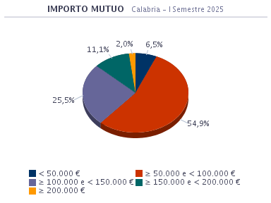 Nel I semestre 2025 l’importo medio di mutuo erogato sul territorio nazionale è stato pari a 127.400 euro, mentre nel semestre precedente ammontava a 122.600 euro. In Calabria il ticket medio è risultato pari a circa 96.000 euro, mentre nel semestre precedente ammontava a 100.400.