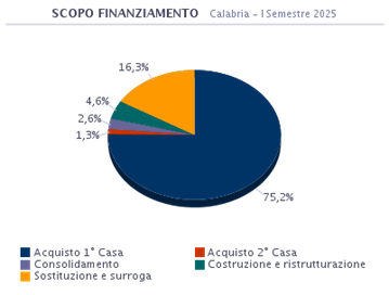 L’acquisto della prima casa in Calabria è la motivazione principale per la quale si sottoscrive un mutuo e rappresenta il 75,2% del totale delle richieste. Chi opta per la sostituzione o la surroga rappresenta il 16,3%. Le operazioni di consolidamento dei debiti, (con il quale si estinguono i debiti accumulati nel breve periodo, sostituendoli con una nuova forma di finanziamento con una diversa rata o una differente tempistica di rimborso) costituiscono il 2,6%. E’ pari al 4,6% la percentuale di coloro che accendono un mutuo per costruire o ristrutturare la propria abitazione. Interessante analizzare anche quanti scelgono un finanziamento per l’acquisto della seconda casa e che costituiscono l’1,3%.