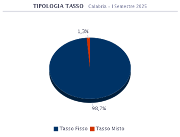 Le dinamiche degli indici di riferimento evidenziano tassi che hanno raggiunto nuovamente valori storicamente minimi e un costo del prodotto (spread) medio più contenuto rispetto agli anni passati. In questo periodo in Calabria il 98,7% dei mutuatari ha optato per un prodotto a Tasso Fisso. La seconda scelta è stata quella per il prodotto a Tasso Misto con l’1,3% delle preferenze.