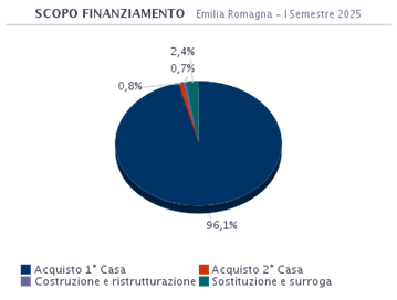 L’acquisto della prima casa in Emilia Romagna è la motivazione principale per la quale si sottoscrive un mutuo e rappresenta il 96,1% del totale delle richieste. Chi opta per la sostituzione o la surroga rappresenta il 2,4%. E’ pari allo 0,7% la percentuale di coloro che accendono un mutuo per costruire o ristrutturare la propria abitazione. Interessante analizzare anche quanti scelgono un finanziamento per l’acquisto della seconda casa e che costituiscono lo 0,8%.