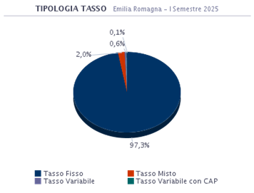 Le dinamiche degli indici di riferimento evidenziano tassi che hanno raggiunto nuovamente valori storicamente minimi e un costo del prodotto (spread) medio più contenuto rispetto agli anni passati. In questo periodo in Emilia Romagna il 97,3% dei mutuatari ha optato per un prodotto a Tasso Fisso. La seconda scelta è stata quella per il prodotto a Tasso Misto con il 2,0% delle preferenze.