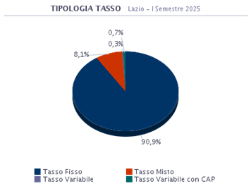 Le dinamiche degli indici di riferimento evidenziano tassi che hanno raggiunto nuovamente valori storicamente minimi e un costo del prodotto (spread) medio più contenuto rispetto agli anni passati. In questo periodo in Lazio il 90,9% dei mutuatari ha optato per un prodotto a Tasso Fisso. La seconda scelta è stata quella per il prodotto a Tasso Misto con l’8,1% delle preferenze.