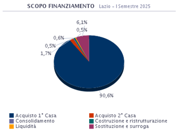 L’acquisto della prima casa in Lazio è la motivazione principale per la quale si sottoscrive un mutuo e rappresenta il 90,6% del totale delle richieste. Chi opta per la sostituzione o la surroga rappresenta il 6,1%. Le operazioni di consolidamento dei debiti, (con il quale si estinguono i debiti accumulati nel breve periodo, sostituendoli con una nuova forma di finanziamento con una diversa rata o una differente tempistica di rimborso) costituiscono lo 0,5%. Chi invece fa ricorso al finanziamento per ottenere maggiore liquidità, per motivazioni diverse da quelle dell’acquisto dell’abitazione a fronte di garanzie patrimoniali, rappresenta lo 0,5% del totale. E’ pari allo 0,6% la percentuale di coloro che accendono un mutuo per costruire o ristrutturare la propria abitazione. Interessante analizzare anche quanti scelgono un finanziamento per l’acquisto della seconda casa e che costituiscono l’1,7%.