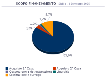 L’acquisto della prima casa in Sicilia è la motivazione principale per la quale si sottoscrive un mutuo e rappresenta l’85% del totale delle richieste. Chi opta per la sostituzione o la surroga rappresenta il 9,7%. Chi invece fa ricorso al finanziamento per ottenere maggiore liquidità, per motivazioni diverse da quelle dell’acquisto dell’abitazione a fronte di garanzie patrimoniali, rappresenta l’1,2% del totale. E’ pari all’1,0% la percentuale di coloro che accendono un mutuo per costruire o ristrutturare la propria abitazione. Interessante analizzare anche quanti scelgono un finanziamento per l’acquisto della seconda casa e che costituiscono il 3,2%.