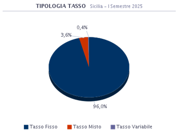 Le dinamiche degli indici di riferimento evidenziano tassi che hanno raggiunto nuovamente valori storicamente minimi e un costo del prodotto (spread) medio più contenuto rispetto agli anni passati. In questo periodo in Sicilia il 96% dei mutuatari ha optato per un prodotto a Tasso Fisso. La seconda scelta è stata quella per il prodotto a Tasso Misto con il 3,6% delle preferenze.