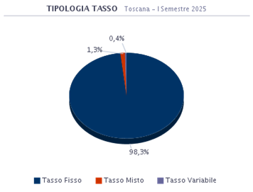 Le dinamiche degli indici di riferimento evidenziano tassi che hanno raggiunto nuovamente valori storicamente minimi e un costo del prodotto (spread) medio più contenuto rispetto agli anni passati. In questo periodo in Toscana il 98,3% dei mutuatari ha optato per un prodotto a Tasso Fisso. La seconda scelta è stata quella per il prodotto a Tasso Misto con l’1,3% delle preferenze.