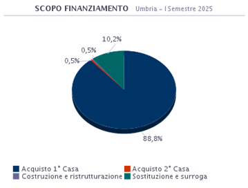 L’acquisto della prima casa in Umbria è la motivazione principale per la quale si sottoscrive un mutuo e rappresenta l’88,8% del totale delle richieste. Chi opta per la sostituzione o la surroga rappresenta il 10,2%. E’ pari allo 0,5% la percentuale di coloro che accendono un mutuo per costruire o ristrutturare la propria abitazione. Interessante analizzare anche quanti scelgono un finanziamento per l’acquisto della seconda casa e che costituiscono lo 0,5%.