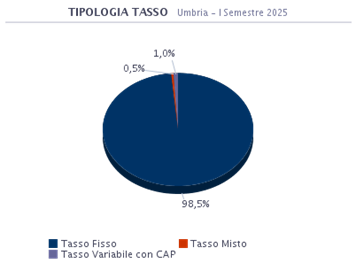 Le dinamiche degli indici di riferimento evidenziano tassi che hanno raggiunto nuovamente valori storicamente minimi e un costo del prodotto (spread) medio più contenuto rispetto agli anni passati. In questo periodo in Umbria il 98,5% dei mutuatari ha optato per un prodotto a Tasso Fisso. La seconda scelta è stata quella per il prodotto a Tasso Variabile con CAP con l’1,0% delle preferenze.