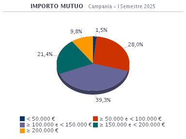 Nel I Semestre  del 2025 l’importo medio di mutuo erogato sul territorio nazionale è stato pari a 127.400 euro, mentre nel semestre precedente ammontava a 122.600 euro. In Campania il ticket medio è risultato pari a circa 136.100 euro, mentre nel semestre precedente ammontava a 131.100.
