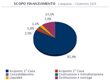 L’acquisto della prima casa in Campania è la motivazione principale per la quale si sottoscrive un mutuo e rappresenta l’82,9% del totale delle richieste. Chi opta per la sostituzione o la surroga rappresenta il 10,1%. Le operazioni di consolidamento dei debiti, (con il quale si estinguono i debiti accumulati nel breve periodo, sostituendoli con una nuova forma di finanziamento con una diversa rata o una differente tempistica di rimborso) costituiscono lo 0,8%. Chi invece fa ricorso al finanziamento per ottenere maggiore liquidità, per motivazioni diverse da quelle dell’acquisto dell’abitazione a fronte di garanzie patrimoniali, rappresenta il 2,6% del totale. E’ pari all’1,1% la percentuale di coloro che accendono un mutuo per costruire o ristrutturare la propria abitazione. Interessante analizzare anche quanti scelgono un finanziamento per l’acquisto della seconda casa e che costituiscono il 2,5%.
