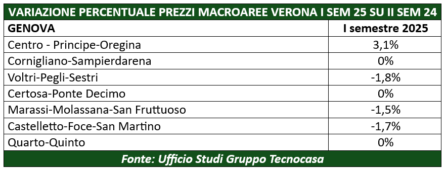 Secondo le ultime analisi dell’Ufficio Studi Gruppo Tecnocasa, nella prima parte del 2025 i valori immobiliari di Genova hanno messo a segno una diminuzione dello 0,5%.
