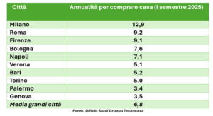 Milano si conferma la città in cui ne occorrono di più: 12,9. Il capoluogo lombardo, infatti, con un prezzo medio di 4466 € al mq si conferma la città più costosa d’Italia. Seguono la capitale con 9,2 e Firenze con 9,1 annualità.