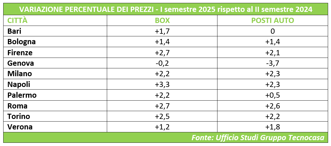 Secondo le analisi dell’Ufficio Studi Gruppo Tecnocasa, nella prima parte del 2025 nelle grandi città i prezzi dei box sono in aumento del 2%, i posti auto dell’1,2%.