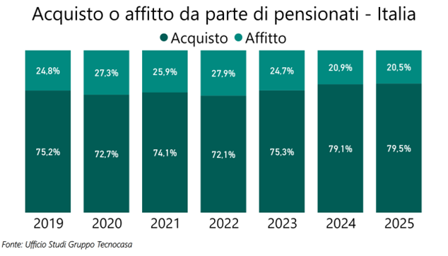 L’analisi delle operazioni effettuate nel 2025 attraverso le agenzie del Gruppo Tecnocasa evidenzia che, nel 79,5% dei casi, i pensionati hanno scelto l’acquisto, mentre nel 20,5% hanno optato per l’affitto. Nel 2024 si registravano quote simili, mentre negli anni precedenti la componente legata all’affitto era più elevata (nel 2022, ad esempio, sfiorava il 28%). Sempre più spesso quindi i pensionati preferiscono l’acquisto all’affitto.