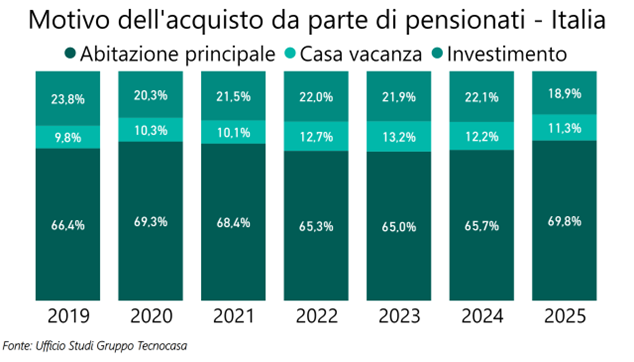 I pensionati che hanno comprato casa nel 2025 lo hanno fatto per viverci nel 69,8% dei casi (abitazione principale), per investimento nel 18,9% e per la casa vacanza nell’11,3% dei casi. Rispetto al 2024 si registra una contrazione degli acquisti per investimento, scesi dal 22,1% al 18,9%. Il calo risulta coerente con l’andamento complessivo del mercato: nel 2025, infatti, la quota di investitori (di tutte le età) in Italia scende dal 19,0% al 17,9%. Da segnalare inoltre una lieve contrazione della percentuale di acquisto di case vacanza che passa dal 12,2% all’11,3%. La maggior parte delle compravendite da parte di pensionati riguarda comunque, come sempre, l’acquisto dell’abitazione principale, con una quota che nel 2025 raggiunge quasi il 70% delle compravendite, mentre nel 2024 si fermava intorno al 65-66%.