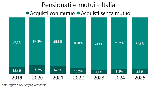 La quota di pensionati che acquista accendendo un mutuo è bassa e si attesta all’8,8% sul totale delle compravendite, si tratta di una percentuale molto simile a quella registrata nel 2024 quando si attestava al 9,3%. La quota di acquisti senza mutuo supera il 91%.