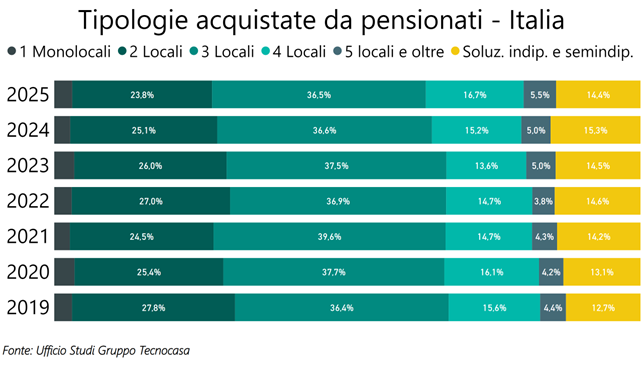 I pensionati comprano soprattutto trilocali, che si attestano al 36,5% delle scelte. Da segnalare un’inversione di tendenza nell’acquisto di soluzioni indipendenti, che negli ultimi anni erano sempre cresciute mentre nel 2025 arretrano e tornano ai livelli del triennio 2021-2023 (14,4%). Prosegue comunque la tendenza all’acquisto di tagli più ampi: nel 2025 i quattro locali e i cinque locali segnalano le quote più alte mai registrate a partire dal 2019, rispettivamente 16,7% e 5,5%.