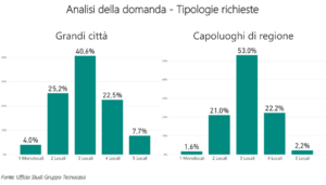 Il trilocale, quindi, si conferma la tipologia più ricercata. Il piccolo taglio, appetibile per chi ha bassa disponibilità di spesa e per gli investitori che in genere scelgono questo taglio, si conferma come soluzione abitativa apprezzata. Nonostante questo, registriamo una diminuzione della concentrazione della domanda sui monolocali, fenomeno compatibile con la contrazione degli acquisti per investimento dovuto in parte a causa all’aumento dei prezzi.