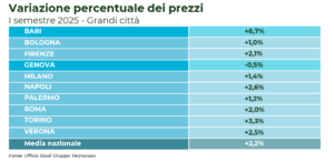 I capoluoghi di provincia segnano un aumento dei prezzi del 2%, l’hinterland delle grandi città del +1,9%. Tra le province delle metropoli si segnala l’aumento dei prezzi più spiccato delle province di Bari (+4,3%), di Firenze (+2,8%) e di Milano (+2,5%).