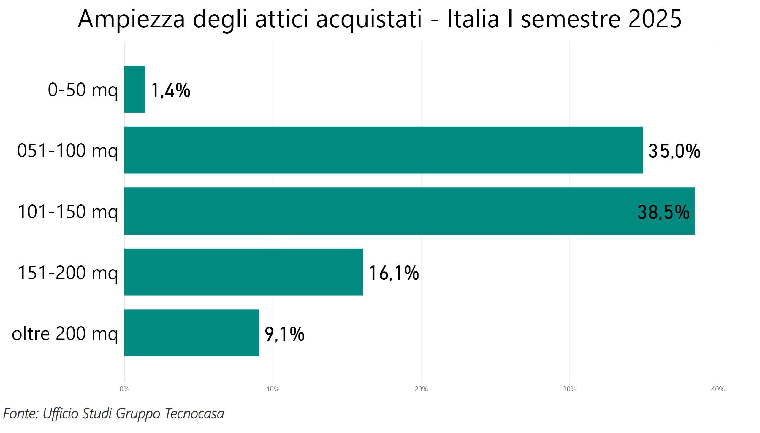 Nella prima parte del 2025 le metrature più compravendute sono quelle comprese tra 101 e 150 mq, che compongono in totale il 38,5% delle transazioni. A seguire con il 35,1% delle scelte ci sono gli attici con ampiezza compresa tra 51 e 100 mq. Rispetto all’anno precedente aumenta la percentuale di compravendite di tagli con metrature che superano i 200 mq, si passa infatti dal 6,6% al 9,1%.