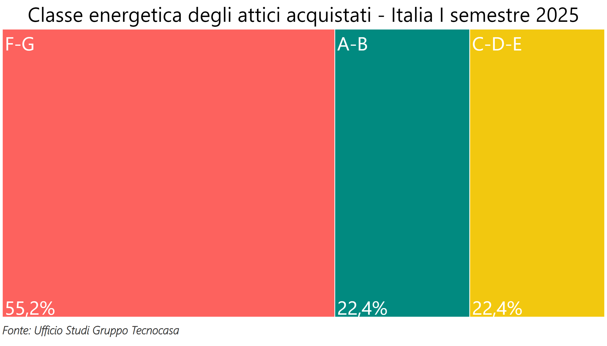 L’analisi evidenzia una buona percentuale di compravendite di attici in classe energetica alta (A e B), che si attesta al 22,4%. Anche le classi energetiche intermedie (C-D-E) arrivano al 22,4%, si tratta di quote in crescita rispetto all’anno scorso, quando le classi energetiche A e B si fermavano al 12,5% e quelle intermedie al 18,8%. Di conseguenza cala la quota di compravendite di attici in classi energetiche basse, che passano dal 68,8% al 55,2%.
