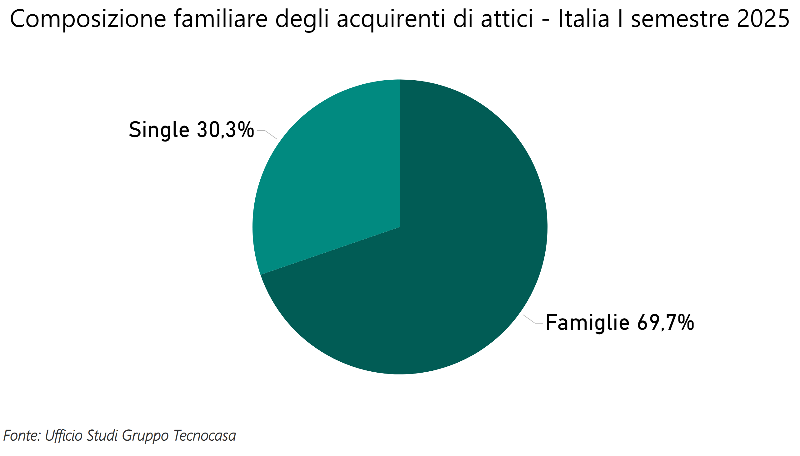 La maggioranza degli acquirenti sono famiglie, che in totale effettuano il 69,7% delle compravendite di attici. In questo semestre si registra un aumento di acquisti da parte di single, che passano dal 24,7% del 2024 all’attuale 30,3%.