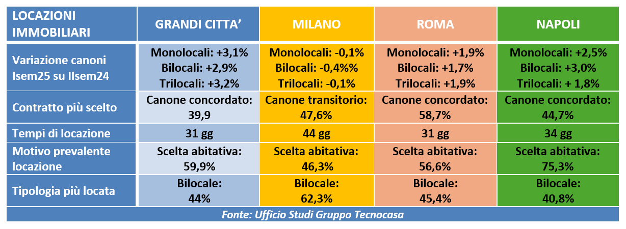 L’Ufficio Studi Gruppo Tecnocasa ha confrontato alcuni indici legati al mondo degli affitti di Milano, Roma e Napoli.