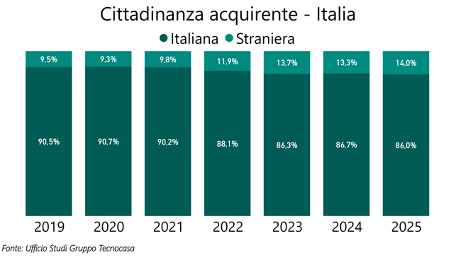 Sempre più stranieri comprano in Italia: 14 acquisti su 100 sono stati conclusi da stranieri nel 2025. Si tratta di una quota in aumento rispetto al 2024, ma anche rispetto agli anni precedenti, evidenziando una costante crescita di acquirenti stranieri a livello nazionale: nel 2019 la percentuale di compravendite da parte di stranieri si fermava al 9,5%, nel 2025 si arriva al 14%.