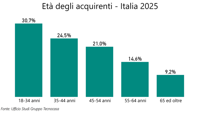 In Italia l’età media degli acquirenti è in leggero calo, si passa dai 43,5 anni del 2024 ai 43,2 anni del 2025. Si tratta di un’età molto simile a quella registrata anche negli anni precedenti, ad eccezione del 2022 quando si era scesi al di sotto dei 43 anni. I più attivi sul mercato rimangono gli acquirenti con un’età compresa tra 18 e 34 anni che compongono il 30,7% del totale, mentre nel 2019 la maggior parte degli acquirenti aveva un’età compresa tra 35 e 44 anni (27,8%).