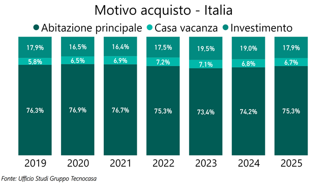 Nel 2025 in Italia si registra un calo della percentuale di acquisti per investimento (17,9%). Nel 2023 e nel 2024 la quota di acquisti per investimento raggiungeva e superava il 19%, risulta quindi evidente un rallentamento di questo tipo di compravendite.