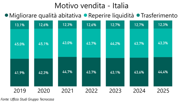 L’analisi si conclude con i venditori: nel 2025 in Italia il 44,4% dei proprietari ha venduto per migliorare la qualità abitativa, il 43,3% per reperire liquidità e il 12,3% per trasferirsi in un altro quartiere oppure in un’altra città. Rispetto al 2024 cresce la percentuale di chi vende e riacquista per migliorare la qualità abitativa.
