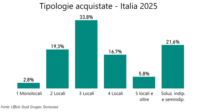 Anche nelle grandi città la tipologia più compravenduta è il trilocale (34,7%), al secondo posto però non ci sono le soluzioni indipendenti ma bensì i bilocali con il 29% delle scelte. A Milano, ad esempio, la tipologia più acquistata è il bilocale (48,2%), mentre a Roma vincono i trilocali con il 39,9% delle compravendite.