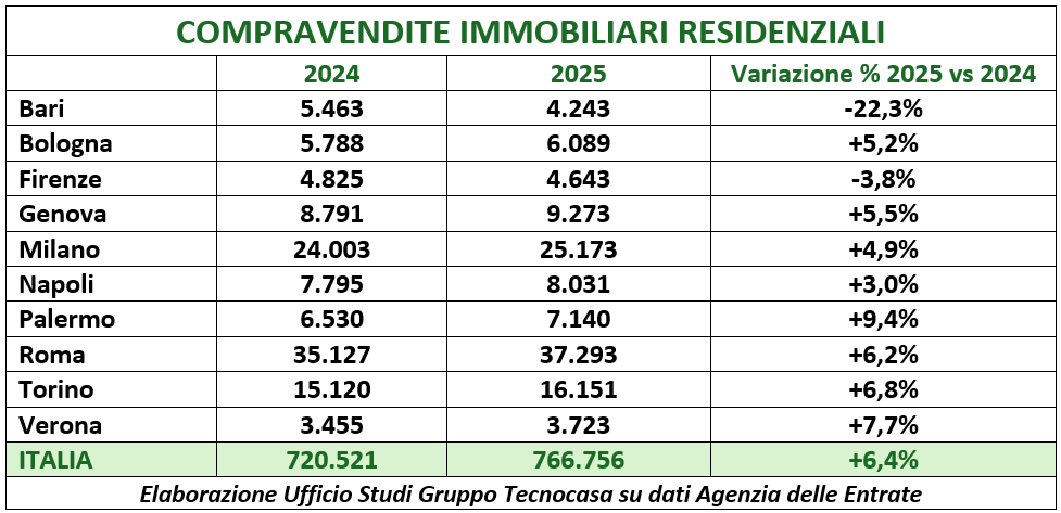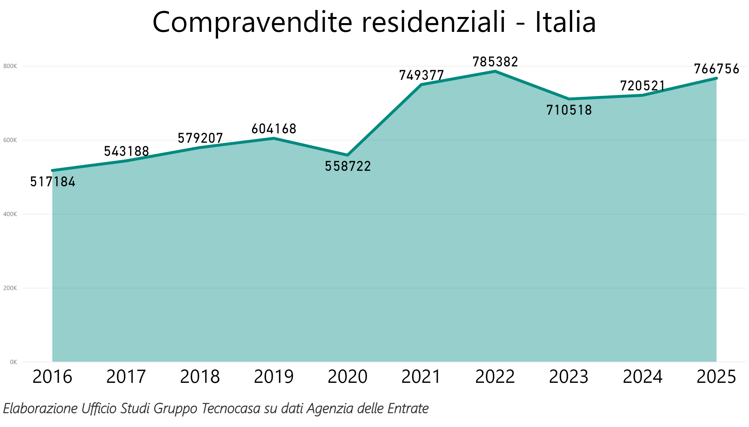 Nel 2025 si sono registrate 766.756 compravendite residenziali, con un aumento del +6,4% rispetto all’anno precedente, secondo i dati diramati dall’Agenzia delle Entrate e analizzati dall’Ufficio Studi del Gruppo Tecnocasa. L’analisi limitata al quarto trimestre evidenzia un aumento dello 0,4%.