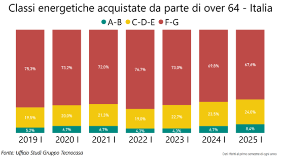 La prima parte del 2025 evidenzia un aumento delle percentuali di acquisto di classi energetiche A-B e C-D-E rispetto ai semestri precedenti, si tratta delle quote più alte registrate a partire dal 2019: le classi A-B arrivano all’8,4%, mentre le classi C-D-E non avevano mai toccato quota 24%. In questo semestre quindi si evidenzia una maggior predisposizione da parte di over 64 all’acquisto di abitazioni in classi energetiche medie ed elevate, mentre diminuisce la quota di acquisto di abitazioni in classi energetiche basse F-G (67,6%), che rimangono comunque la fetta più importante del mercato.