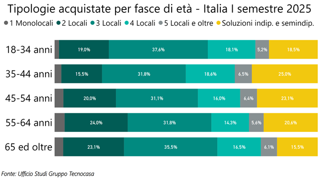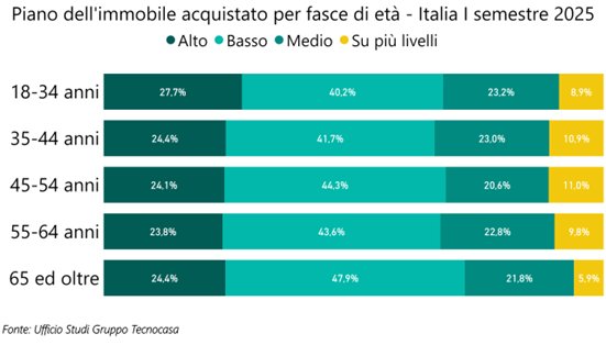 Gli over 64 acquistano prevalentemente abitazioni posizionate ai piani bassi (47,9%), mentre piani medi e piani alti si attestano rispettivamente al 24,4% e al 21,8%. Rimane poi un 5,9% di acquisti di tipologie distribuite su più livelli, si tratta soprattutto di soluzioni indipendenti e semindipendenti. Anche nelle altre fasce di età prevalgono gli acquisti ai piani bassi, ma le percentuali sono più contenute, ad esempio tra i 18 e i 34 anni le compravendite ai piani bassi si fermano al 40,2%. La scelta del piano basso può essere legata a questioni economiche, sono meno costosi, ma anche a una maggiore comodità.